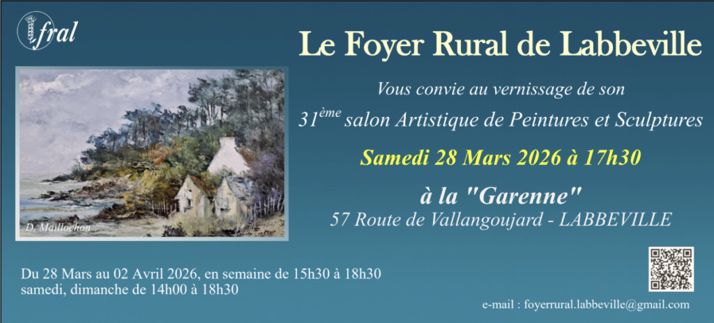 Je vous invite au vernissage du 31ème Salon Artistique de Labbeville. C’est une étape importante pour moi, et votre présence me toucherait beaucoup.