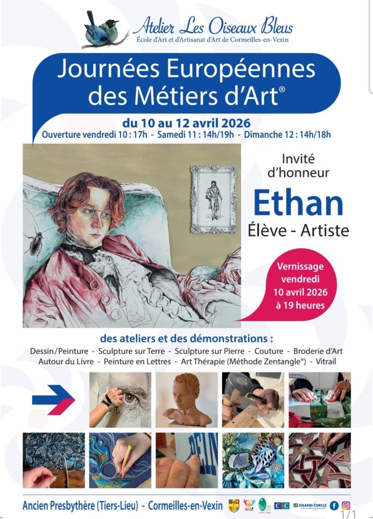 • Horaires du week-end : L’exposition reste ouverte le samedi 11 avril (14h-19h) et le dimanche 12 avril (14h-18h). Vous y retrouverez également, le dessin d’art, la peinture sur verre et le vitrail qui dialogueront avec la sculpture sur terre et sur pierre, la broderie, la couture, la plumasserie et la peinture décorative.