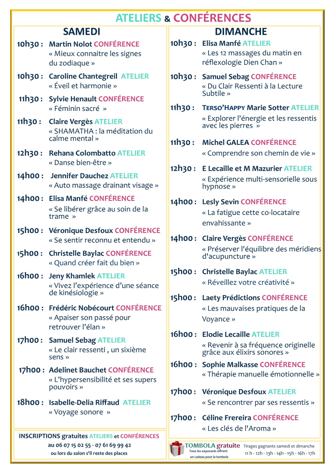• Dates : Samedi (10h-19h) et Dimanche (10h-18h).  Vous trouverez en pièces-jointes l’ensemble des exposants ainsi que les ateliers et conférences prévus durant tout le weekend.   .